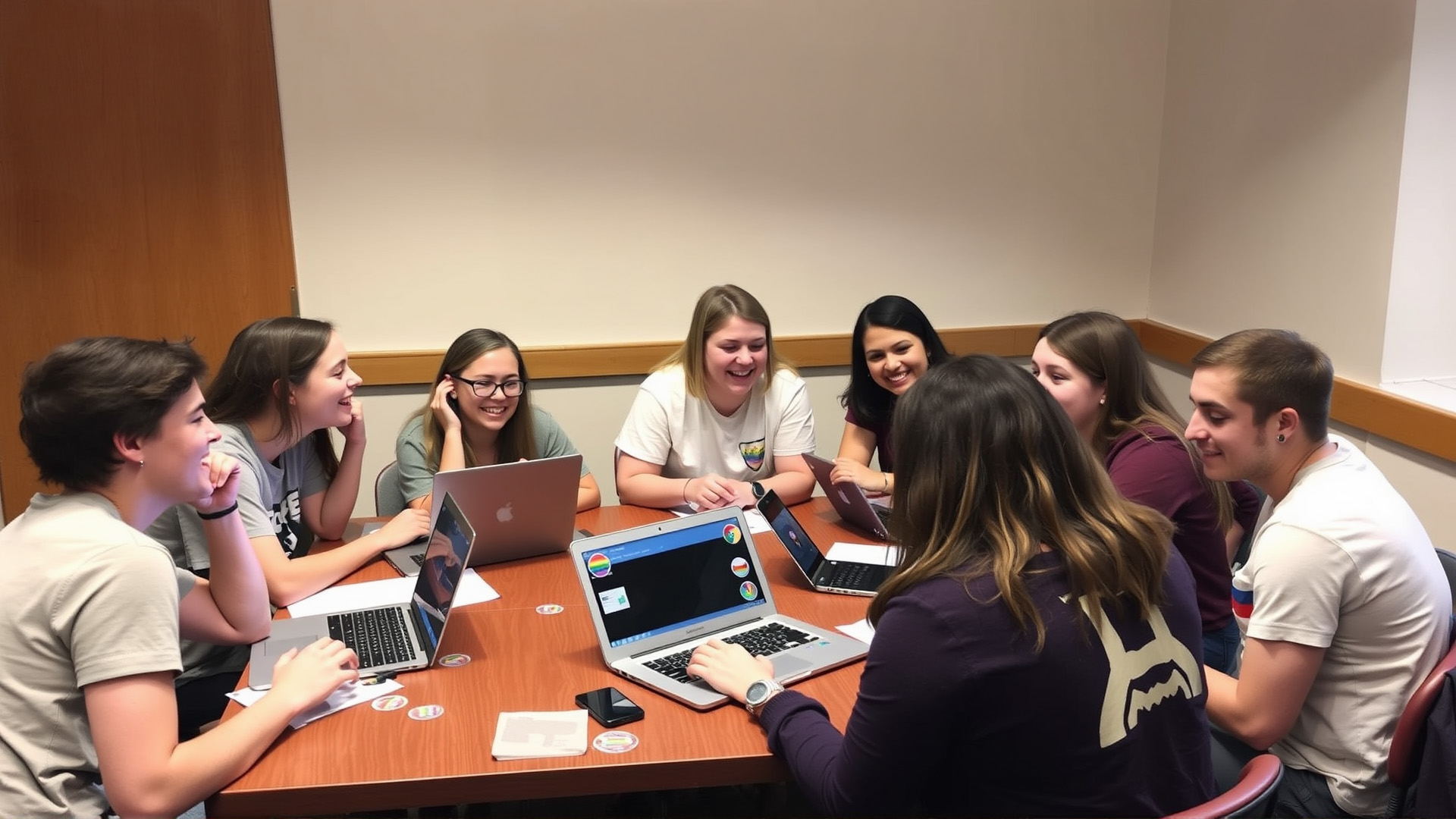 A diverse group of LGBTQ+ teens meeting around a table with laptops, pride stickers, and handmade posters.