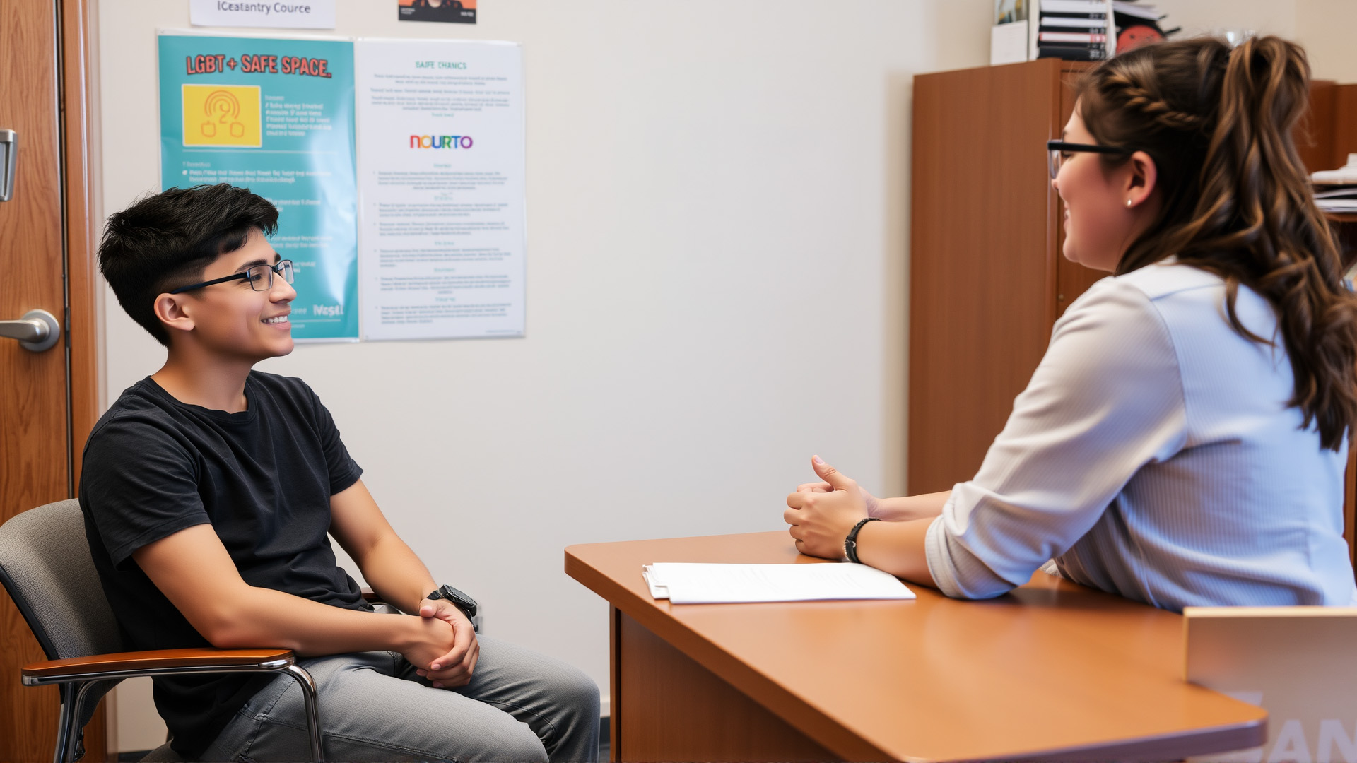 This photograph illustrates accessible mental health support in Tucson schools. The LGBTQ+ student and affirming therapist highlight TUSD’s partnerships with TalkSpace and Talk It Out.
