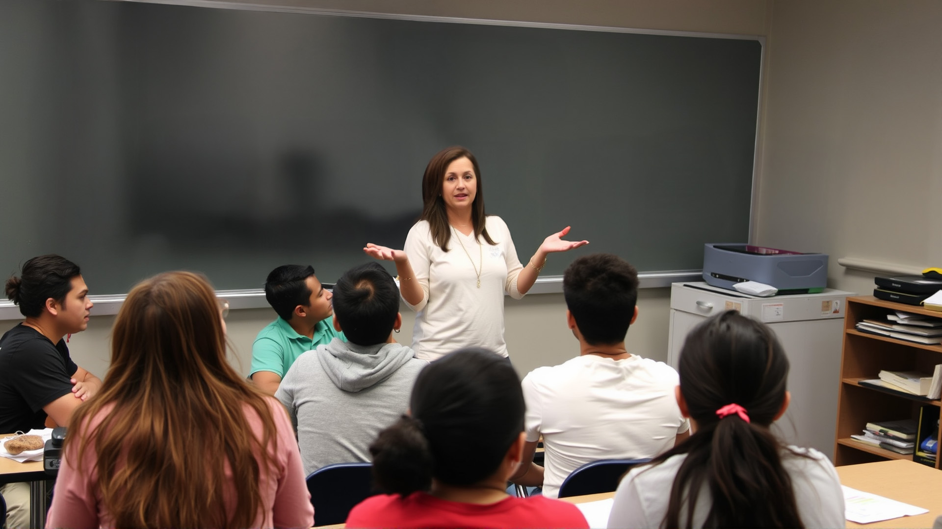In contrast to national censorship trends, this image shows a Tucson teacher facilitating open dialogue, with Pride flags and equity messages displayed prominently.