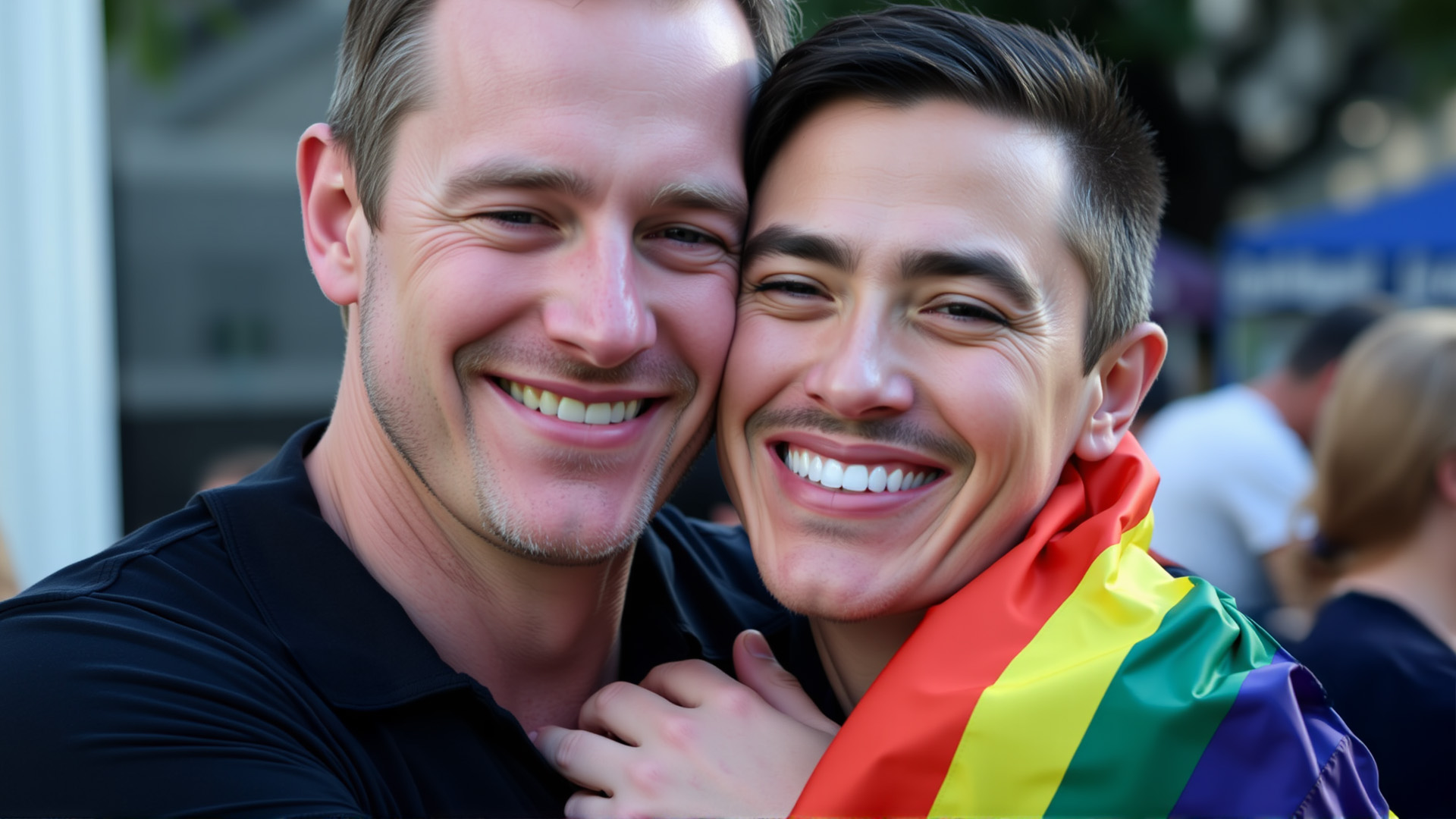 A candid photo of a straight ally embracing their LGBTQ+ friend at a Pride celebration, reflecting mutual support and joy. Allyship begins with empathy and action in personal relationships.