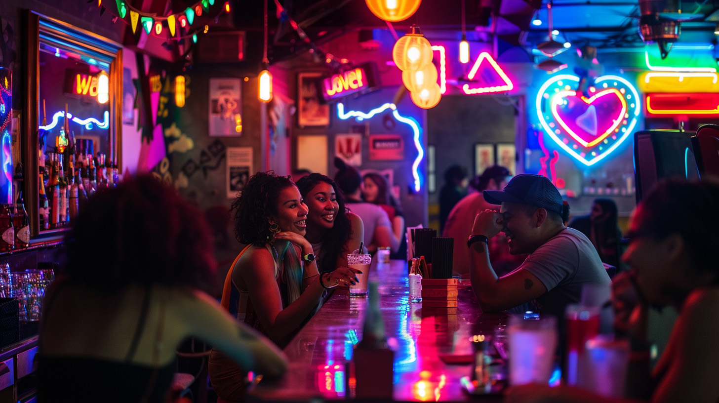 People socializing and enjoying drinks at Brodie's Tavern, a gay-friendly bar in Tucson, with neon signs and festive decorations.