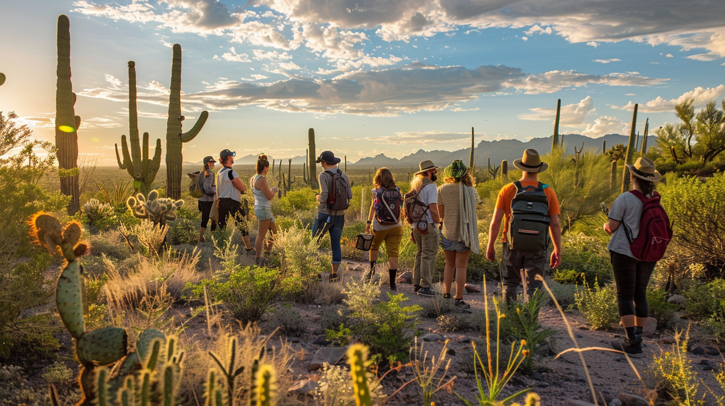 The image captures the natural beauty of Saguaro National Park in Tucson, a must-see for LGBTQ travelers. The photo features towering cacti and a backdrop of Tucson’s mountains. A diverse group of hikers is shown enjoying the trail, highlighting the park’s appeal to outdoor enthusiasts.
