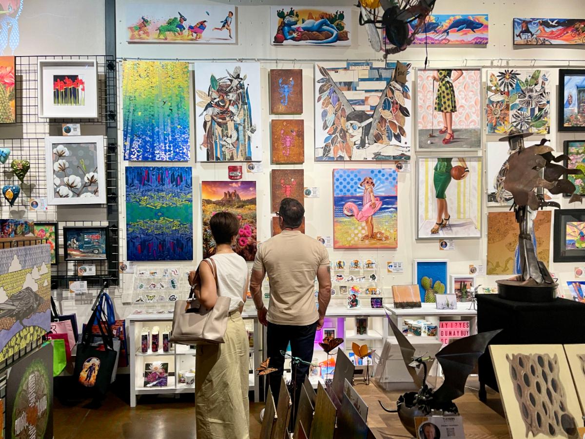 This photo captures a couple deeply engaged with the art at Tucson Gallery, reflecting the gallery’s welcoming and inclusive atmosphere. The image showcases the couple admiring various art pieces, illustrating the rich cultural experiences available to LGBTQ travelers in Tucson.